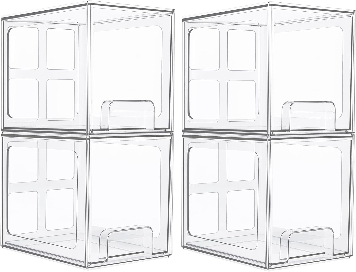 [Stackable Design] Come with 4 drawer storage organizers, each organizer measures 6”W x 7.5”Lx 6.6”H. The storage containers are stackable, vertical storage will save a lot of space. It can put skin care products up to 6" in height.Perfect for organizing face creams, body lotions and more.Cosmetics will be no longer covered in dust. [Multi-Purpose Organizers] Our storage drawers help you to organize everywhere in your home, they can be used as organizers and storage for makeup, bathroom countertop, kitchen or laundry under sink, medicine cabinet, pantry, vanity. You can flexibly use our storage organizer for house organization and storage according to your needs. [Handy Storage Drawers Set] The storage containers are designed with pull-out handles, it is convenient for you to store and take out items, providing you with easy organization and storage. Light weight and easy to transport, they are ideal storage helpers in apartments, condos, dorm rooms, RV's and campers. [Keep Your Home Organized] Our acrylic organizer bins help you to organize your home with style. They are clear, which help you to identify contents easily. Keep items contained, organized and dust-free and create a neat space of your bathrooms, laundry, bedrooms, offices, garages, toy rooms, craft rooms and playrooms, refrigerator, cupboards or pantry shelves. [Qualtity Construction and Easy to Clean] Made of durable BPA free shatter-resistant plastic. The sturdy, transparent and fashionable design is compatible with decoration of any rooms. PLEASE DO NOT PUT IN DISHWASHER. Easily clean with soap and warm water.