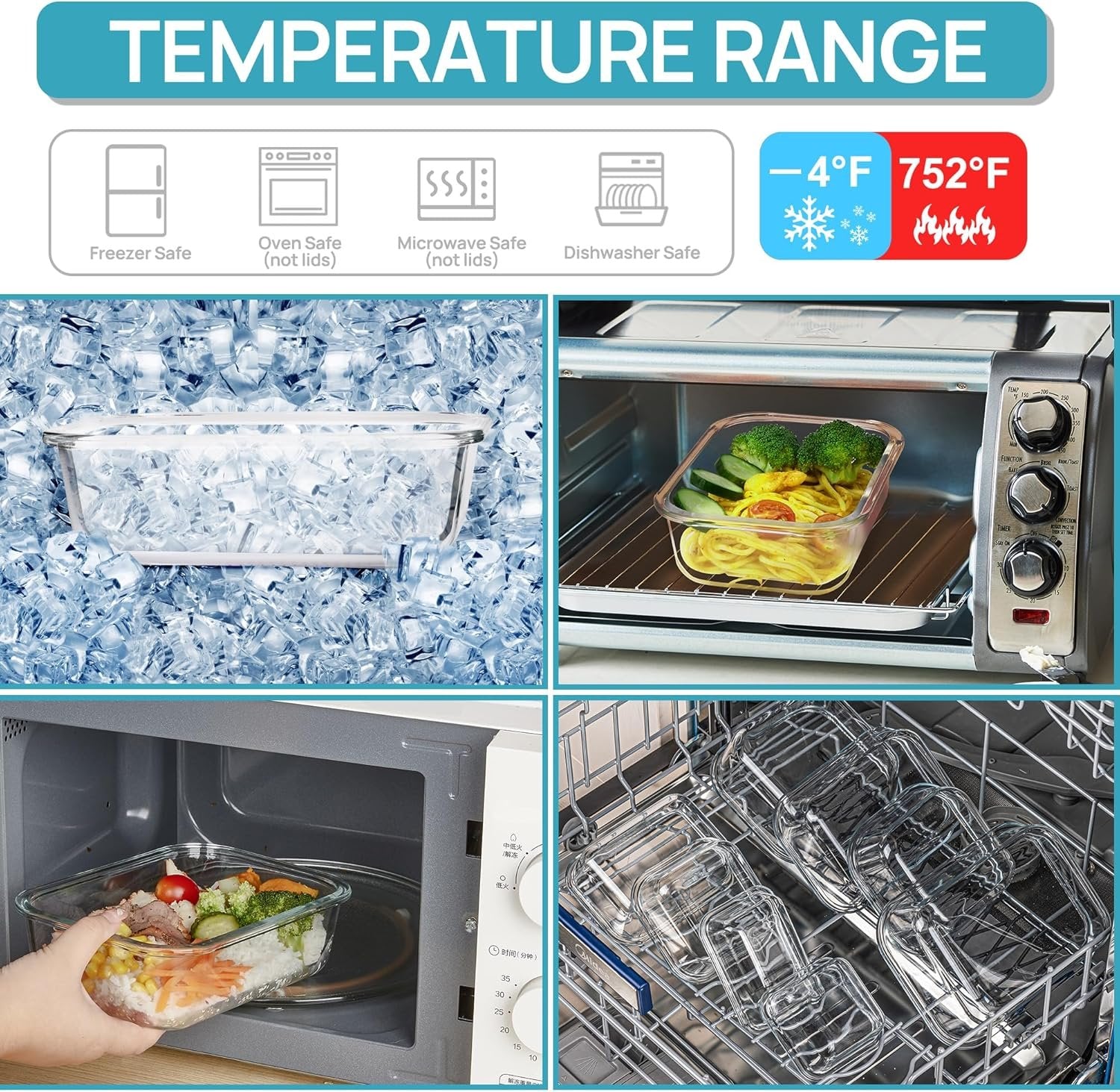 AIR-TIGHT & LEAKPROOF --Each lid comes with innovative hinged lids and makes the lid easy to flip open & shut, ensuring zero leaking or spilling, never endure spilled soup or sauce dirty your bag again, and keeping food fresh for longer periods. SAFE FOR OVEN/ MICROWAVE/ FREEZER/ DISHWASHER--The glass meal prep containers are safe for the oven, microwave, dishwasher, and freezer. It can withstand temperatures from -4ºF to 752ºF (-20ºC to 400°C). (Note: Before putting it into the microwave/ oven, please take off the lid.) STACKABLE DESIGN--The food storage containers can keep the home and kitchen organized. Clear glass makes it easy to identify the contents of the container, making it easier to sort, organize, and store food. When you don't use them, they can be stacked into each other to save space. 5PACK GLASS STORAGE CONTAINERS WITH LIDS--5 glass food storage containers with 5 lids. The large capacity 35oz food storage containers for meal prep, office lunches, leftovers, and portion control, fulfill all your storage needs. Perfect for bringing to the gym, picnics, barbecues and more.