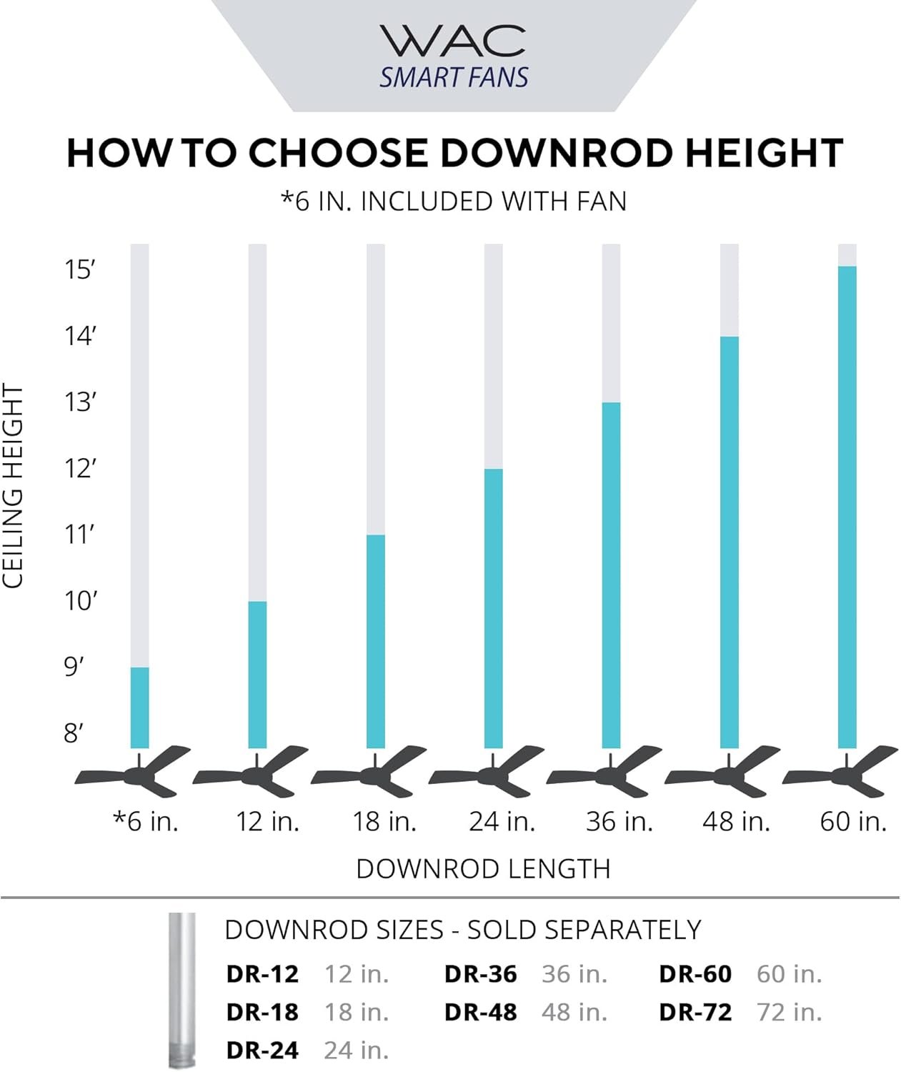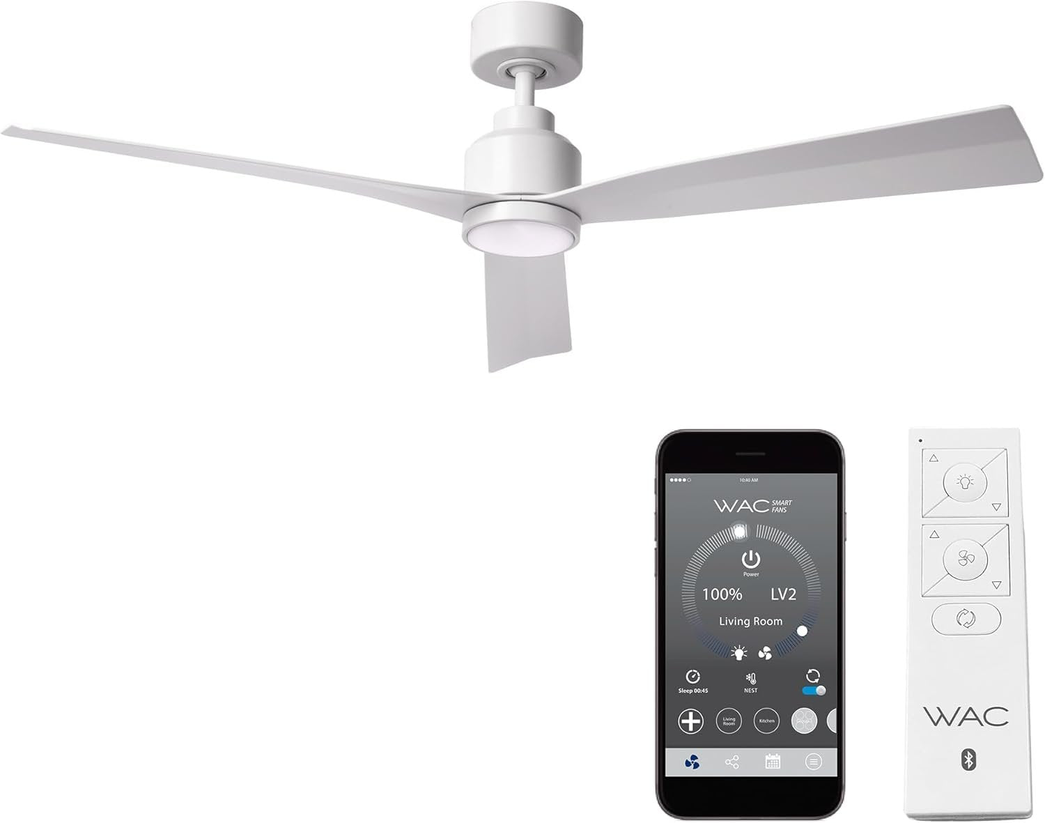 SMART: WAC Smart Fans can be controlled from the WAC Smart Fan app, enabling smart features and full control of your fan from an iOS or Android device. Download the app to pair with the smart home tech you know and love, including Google Assistant, Amazon Alexa, Samsung Smart Things, and more! FEATURES: The WAC Smart Fan iOS or Android app can sync with your ceiling fan to control fan speed, use smart features like breeze mode, adaptive learning, create groups, and reduce energy costs. High quality ABS blades ensure your fan blades don't droop or sag over time. TECHNOLOGY: WAC Smart Fans are made with incredibly efficient and completely silent DC motors and are up to 70% more efficient than traditional fans. Every fan is factory-balanced and sound tested to ensure each fan will never wobble, rattle or click. STANDARDS: UL & cUL Wet Location Listed for indoor or outdoor applications. Includes a 6in Downrod and can be mounted on slope ceilings. Additional downrod lengths sold separately (SKU # DR-FINISH). WAC warranties all ceiling fans for 5-years. NOTE: model # F-003L includes a high lumen output (1600 lumens) replaceable LED luminaire powered by WAC Lighting with smooth and continuous brightness control. Model # F-003 does not include the LED luminaire.