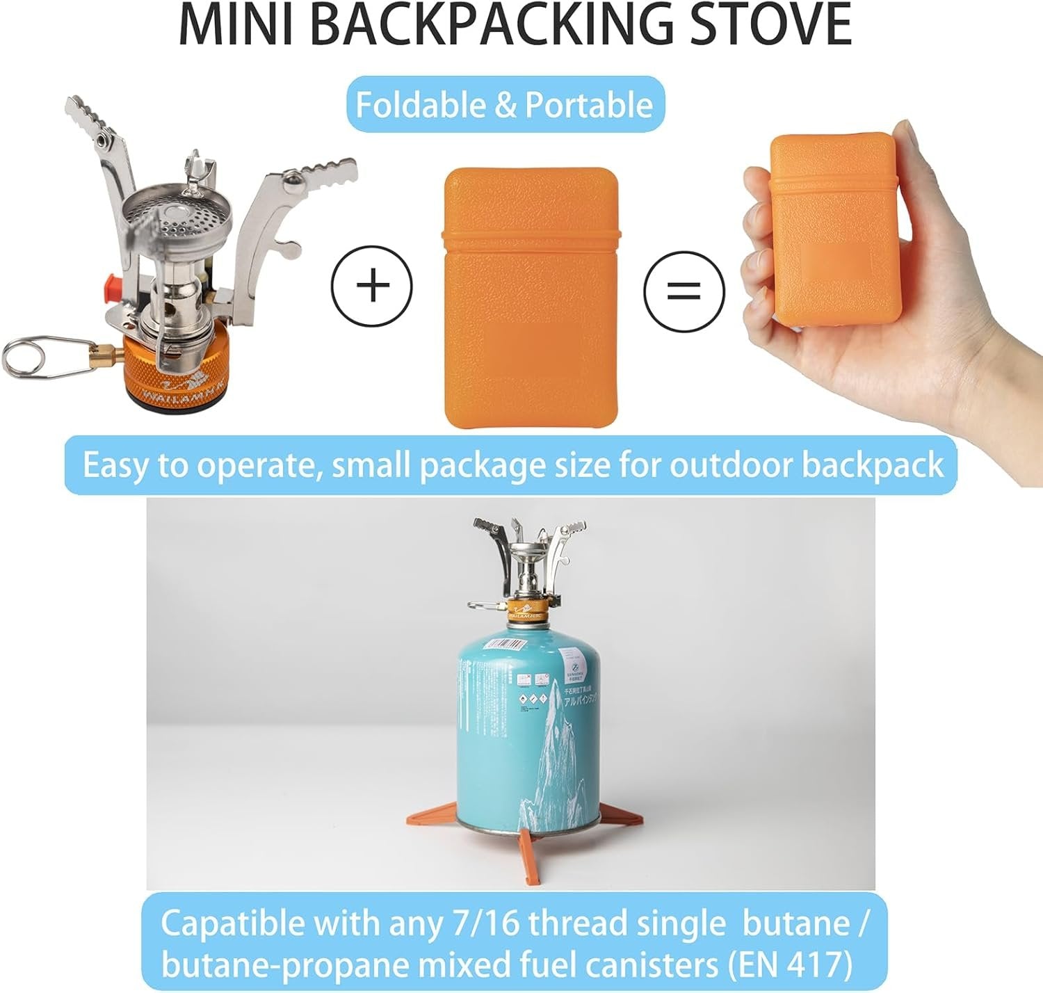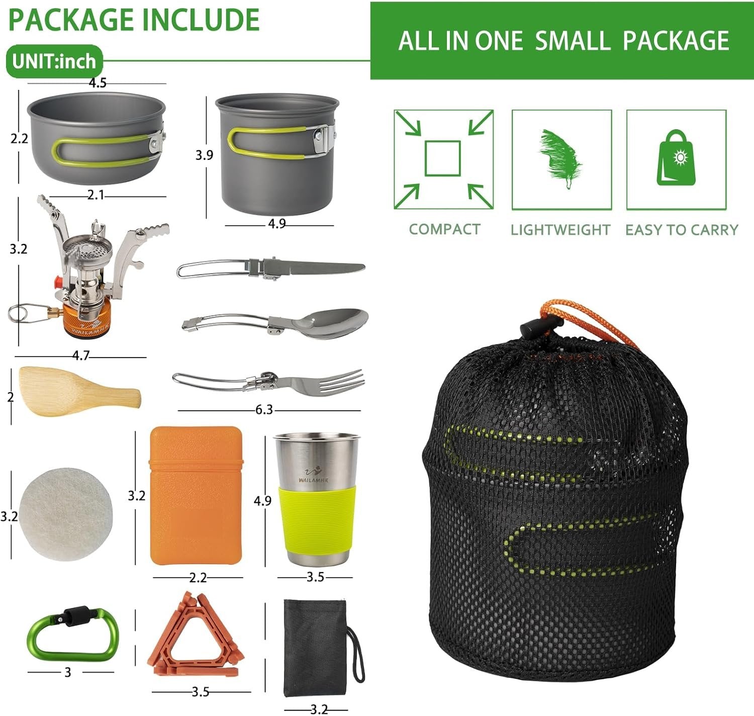 WAILAMHK 14pcs Camping Cookware Mess Kit with Lightweight Pot, Stove, Spork and Carry Mesh Bag, Great for Backpacking Outdoor Camping Hiking and Picnic