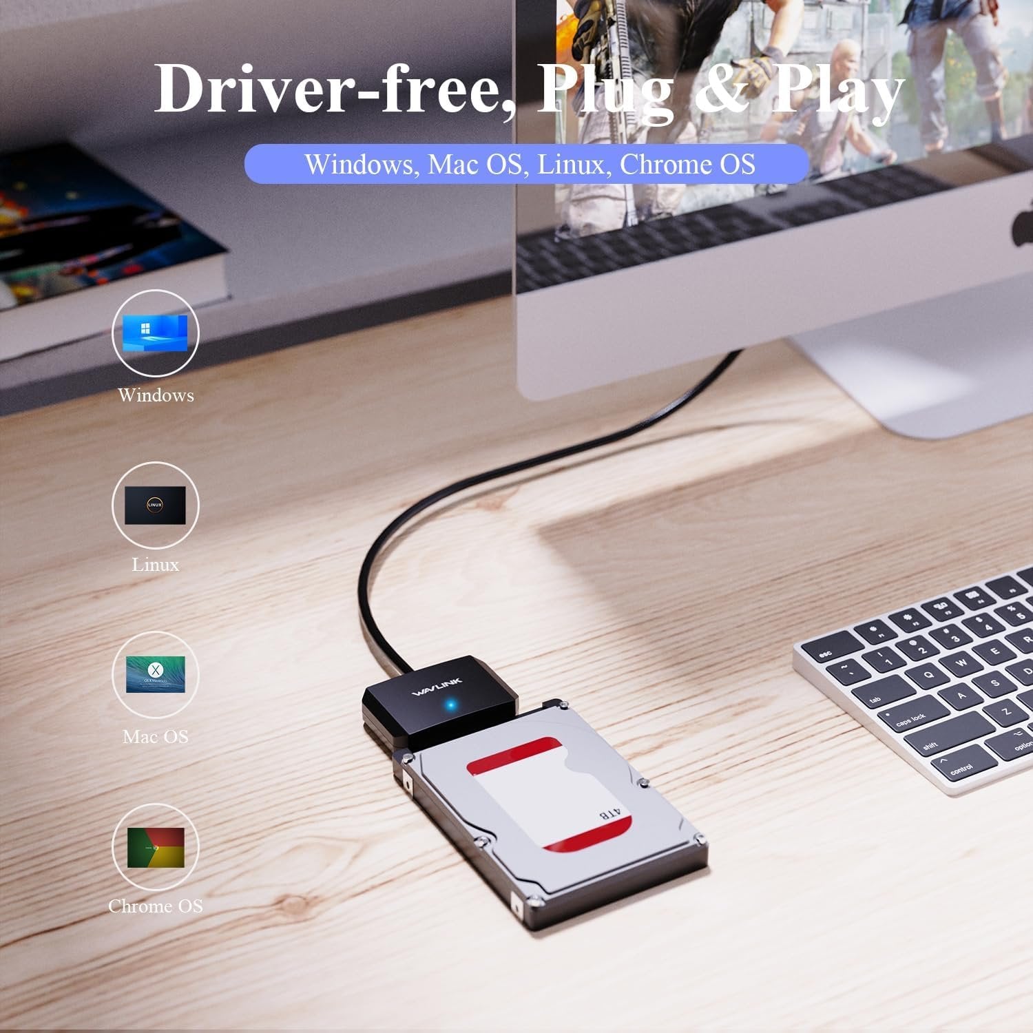 Widely Compatible with PCs & Laptops: The USB A to SATA converter is widely compatible with most of systems, such as Windows 11/10/8/8.1/7/Vista/XP, MacOS, Linux, Chrome, Android, etc. It fits with most 2.5" SATA III/II/I HDD (Hard Disk Drive) & SSD (Solid State Drive) and 3.5" HDD up to 18TB, compatible with your USB-A equipped devices including laptop, tablet, desktop, HDTV, router. Making sure that your phone supports OTG function. Power required for 3.5" HDD Considerate Details: The convenient blue LED indicator provides a clear visual indication of the adapter's working status. With its 3-minute auto sleep mode feature, the adapter intelligently conserves energy by entering sleep mode when inactive. Moreover, the use of PVC materials enhances the durability and strength of the adapter. Its lightweight and slim design adds to its portability, making it an ideal solution for on-the-go usage Super Speed USB3.0: Quickly connect 2.5/3.5inch SATA SSD HDD to a USB port with data transfer rates of up to 5Gbps (The actual transmission speed is limited by the setting of the device connected). Backward compatible with USB 2.0/1.1 Quickly Access a SATA SSD/HDD: WAVLINK SATA to USB 3.0 Adapter can easily connect a 2.5" SSD/HDD and 3.5" HDD with your USB-A equipped device to expand storage, upgrade system, back up files, retrieve and recover data, and transfer data. It is awesome for booting up old spare hard disks and recovering important files of broken PC You Will Get: 1 х USB-3.0 to SATA Adapter, 1x Power Adapter, 1x Quick Start Guide and life-long friendly customer service and technical support