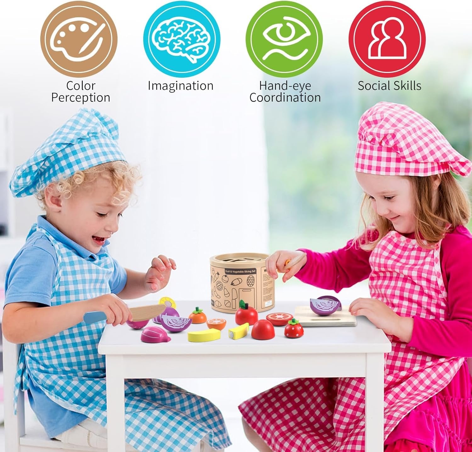 RICH TOY FOOD: 19 common foods set, including fruits, vegetables, fish, burgers, bread, desserts, steaks and more! Add a cutting board, two knives and a storage bucket. More interesting and playable than small food sets, it cultivates the independent storage ability of children aged 1-3. Great for pretend play breakfast, lunch, and dinner WOODEN TOYS: We all know that wooden toys are safer and more durable than plastic toys. This food-cutting accessory has been proven safe and all accessories are made of non-toxic, high-quality natural wood with smooth edges to avoid injuries to little hands. Parental companionship and encouragement will make toys twice as meaningful IMITATION AND MONTESSORI TOYS: Children mostly like to imitate the adults around them, so they are easily attracted by these colorful wooden toy kitchen accessories. Children gain fine motor skills, hand-eye coordination and grasping skills through cutting, and numeracy skills through counting pieces. This is an indispensable educational and enlightenment toy for kids aged 2-5 years old ROLE PLAY AND PLAY KITCHEN: Children can play this pretend play food set with their parents, friends, or classmates, pretending to be a little chef or a good kitchen assistant. They can shop in the supermarket, inquire about food, make breakfast, lunch, and dinner, and pursue new knowledge while playing in the imaginative kitchen creating delicious meals for the family to enjoy EASY TO STORE AND IDEAL GIFT: The best birthday and Christmas gift for children aged 2-8. The food storage bucket is suitable for kids to hold. They are very happy to carry the bucket to "show off" their treasures to others. It helps keep the house clean and cultivates children's habit of tidying up their toys. Let children grow up in happy games