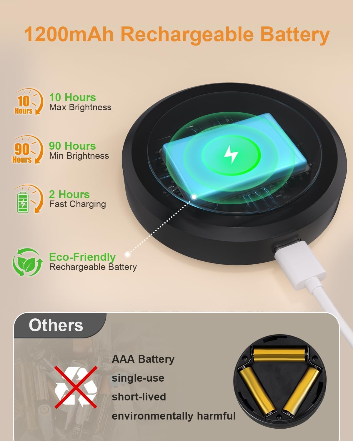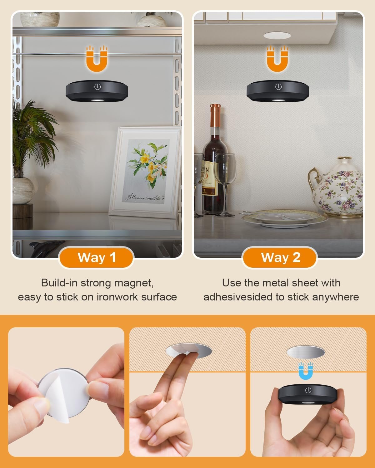 [Rechargeable & Energy-Saving]These under cabinet lighting come with a built-in 1200mAh rechargeable battery, eliminating the need for disposable batteries—better for the environment and your wallet. Each rechargeable puck light lasts up to 10 hours at maximum brightness and 90 hours at minimum brightness. The 3-in-1 USB Type-C cable allows you to charge three lights at once, saving you time and up to 80 AA batteries per year, per light. [Two Control Modes & Timer Function]The under-cabinet lights offer two control options: touch control and remote control. A short tap lets you turn the lights on/off or switch between colors, while a long press adjusts the brightness. The remote also features a timer, allowing you to set the rechargeable puck lights to automatically turn off after 15, 30, or 60 minutes. These tap lights are an excellent choice for cabinet, countertop, closet, or shelf lighting. [2 RGB Dynamic Modes & Dimmabl] These tap lights feature 9 colors and two RGB modes to set the perfect atmosphere. In Smooth Mode, 13 vibrant colors gracefully cycle in and out. Alternatively, you can select Fade Mode for a calming transition of single-color brightness, mimicking a gentle breathing light. Use the remote to adjust the brightness to three levels (30%, 50%, 100%). A quick touch of the on/off button changes the color, while a long press allows for seamless brightness adjustment. [Wireless Portable & Easy Install]Method 1: Each puck lights features built-in strong magnets, allowing you to effortlessly attach it to any metal surface. Method 2: Use the included adhesive iron sheet for quick installation—just peel and stick in just 3 seconds! These magnetic puck lights with remote are easy to remove, making them portable and perfect for use in closets, cabinets, bedrooms, kitchens, counters, wardrobes, shelves, and more. [Free Replacement]We offer a 12-month warranty on our battery powered tap lights. If you encounter any issues after receiving or using our rechargeable puck lights, please don’t hesitate to contact us.