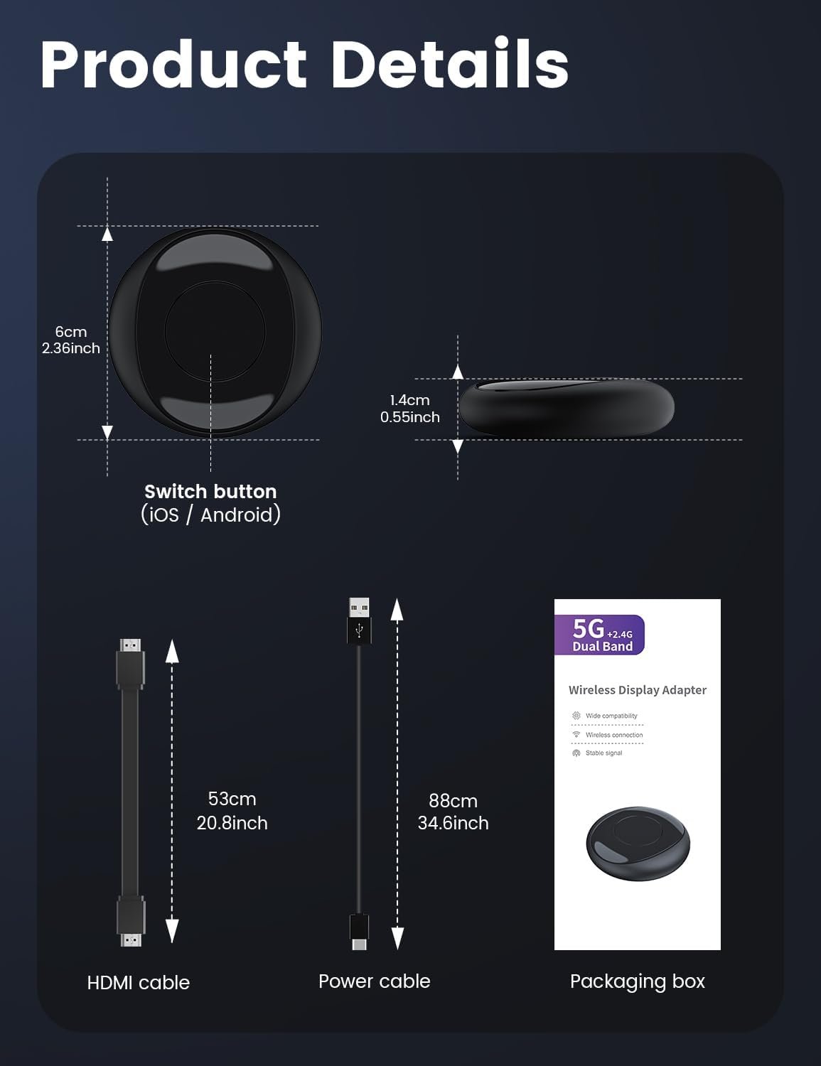 【Seamless Wireless Streaming】:Effortlessly stream HD videos, photos, and presentations from your laptop, smartphone, or tablet to your TV or projector. No more messy cables—just pure, uninterrupted entertainment. 【Plug-and-Play Simplicity】:Simply plug the dongle into your HDMI port, connect via Wi-Fi, and start mirroring your screen instantly. No complicated setups or software installations required—perfect for tech beginners and pros alike. 【Crystal-Clear HD Quality】:Enjoy stunning 1080p Full HD resolution with zero lag, ensuring a smooth and immersive viewing experience for movies, gaming, or business presentations. 【Universal Compatibility】:Works seamlessly with a wide range of devices, including Windows, macOS, Android, and iOS. Whether you're using a laptop, phone, or tablet, this adapter has you covered. 【Compact & Portable Design】:Take your entertainment anywhere! This lightweight and pocket-sized dongle is perfect for home, office, or on-the-go use. Transform any HDMI-equipped display into a wireless powerhouse in seconds. Note: This product does not support Google phones. Windows system devices must be Intel chips, graphics cards and network cards to use, otherwise they cannot be used.