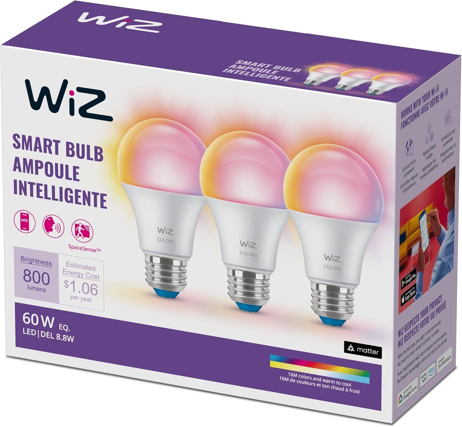 WiZ Connected 60W A19 LED Smart Light Bulbs - Connects to Your Wi-Fi - E26 Smart Bulb - Control with Voice or App + Activate with Motion - Matter Compatible - 3 Pack