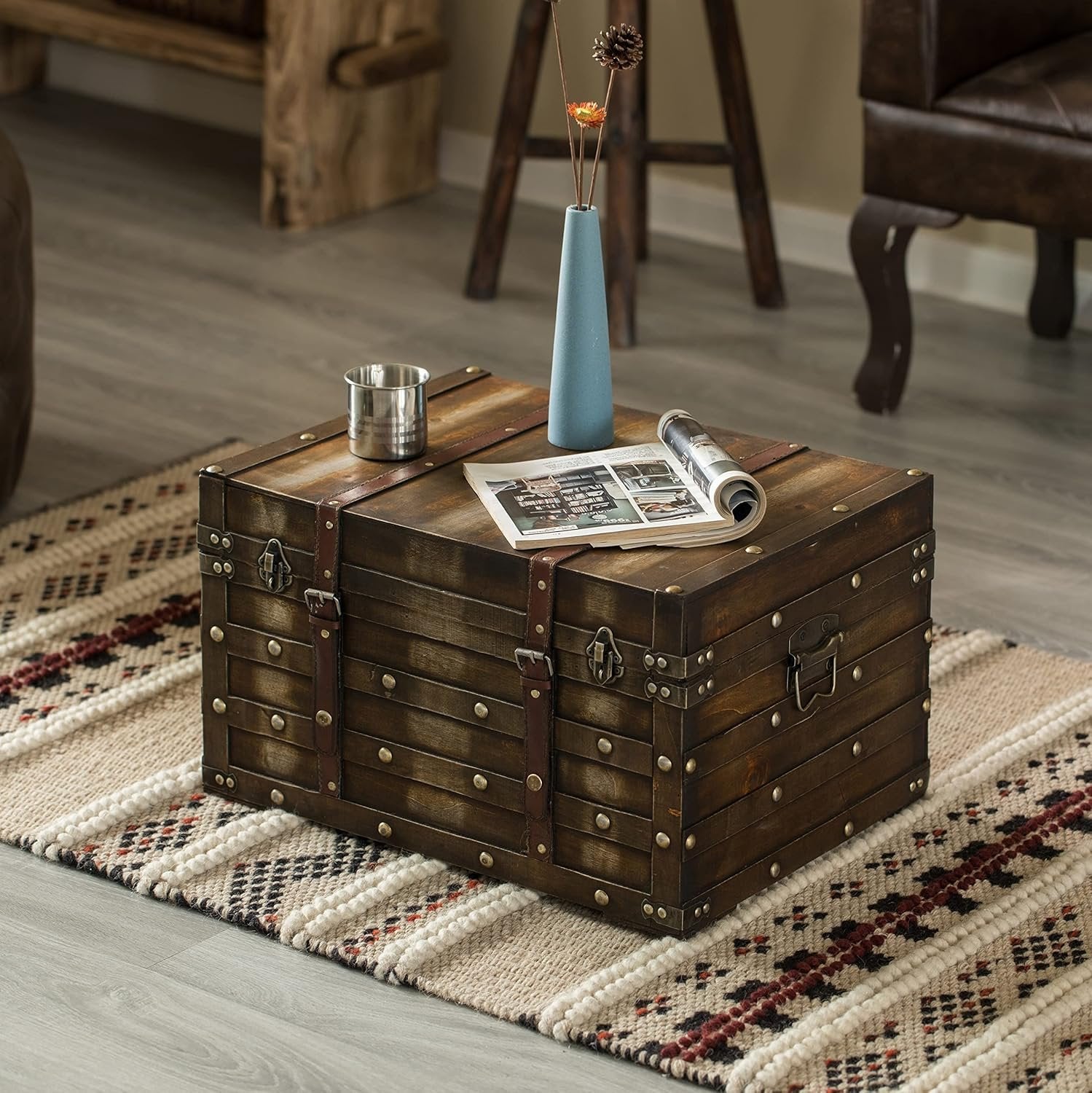 Wooden Brown Storage Trunk with Faux Leather Straps and Handles (Large)