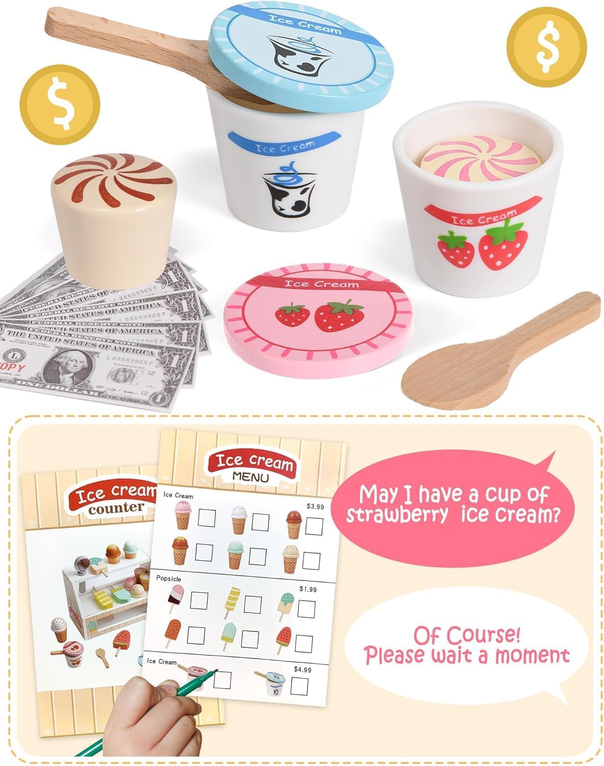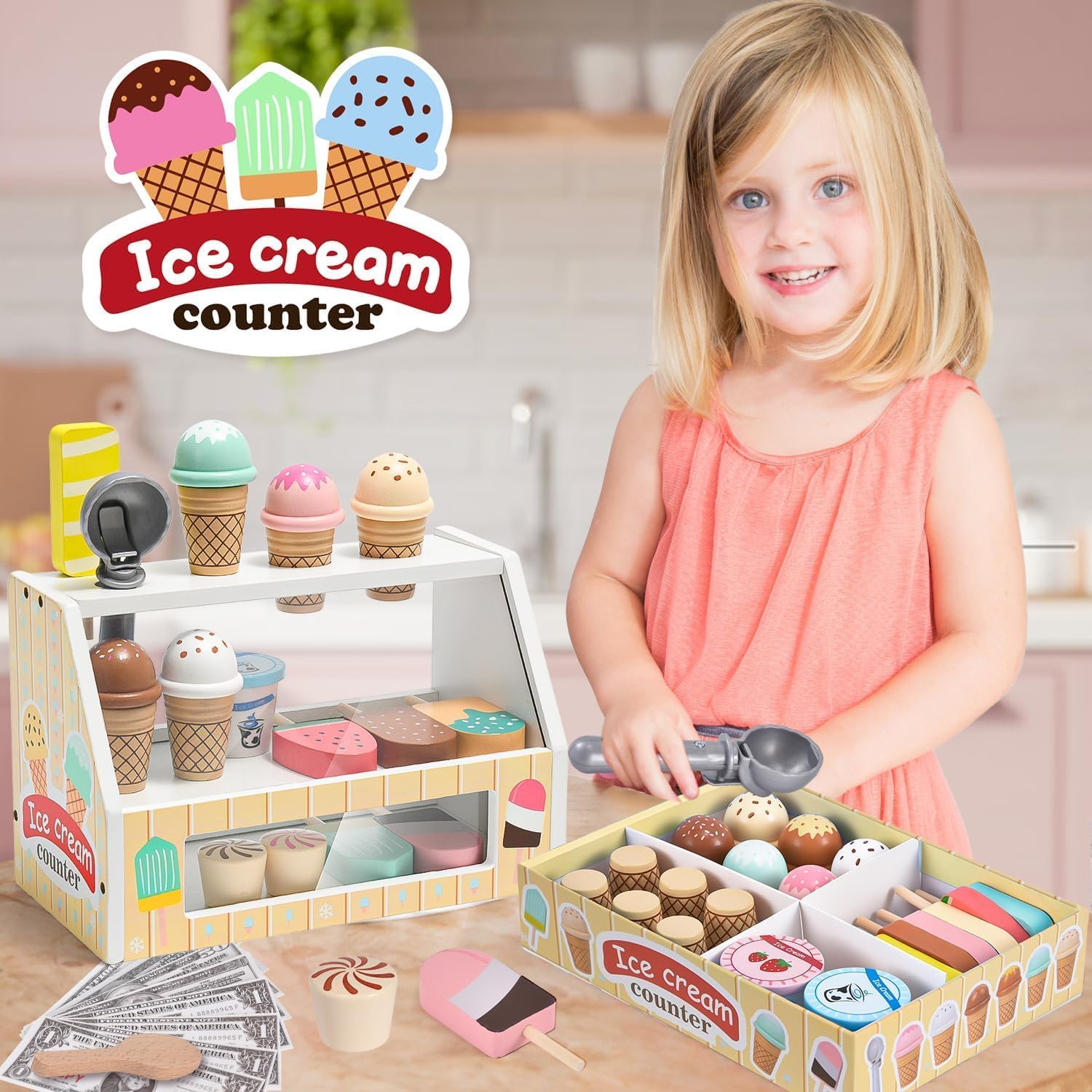 Wooden Ice Cream Toys Kids Pretend Play Store Toys for Toddlers Girls 3-5, Play Kitchen Accessories with Counter & Menu, Wooden Food Christmas Birthday Gifts for 3 4 5 Year Old Girls Boys