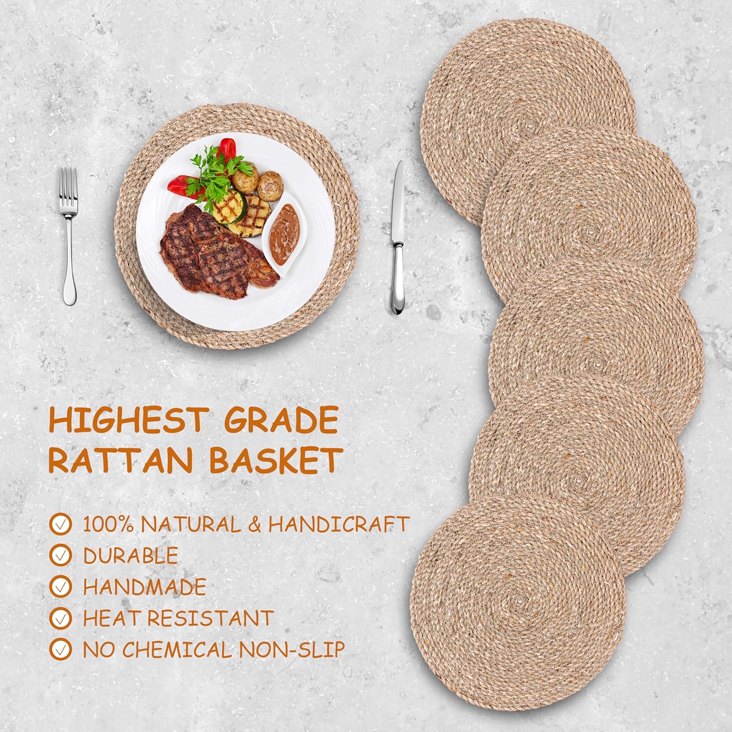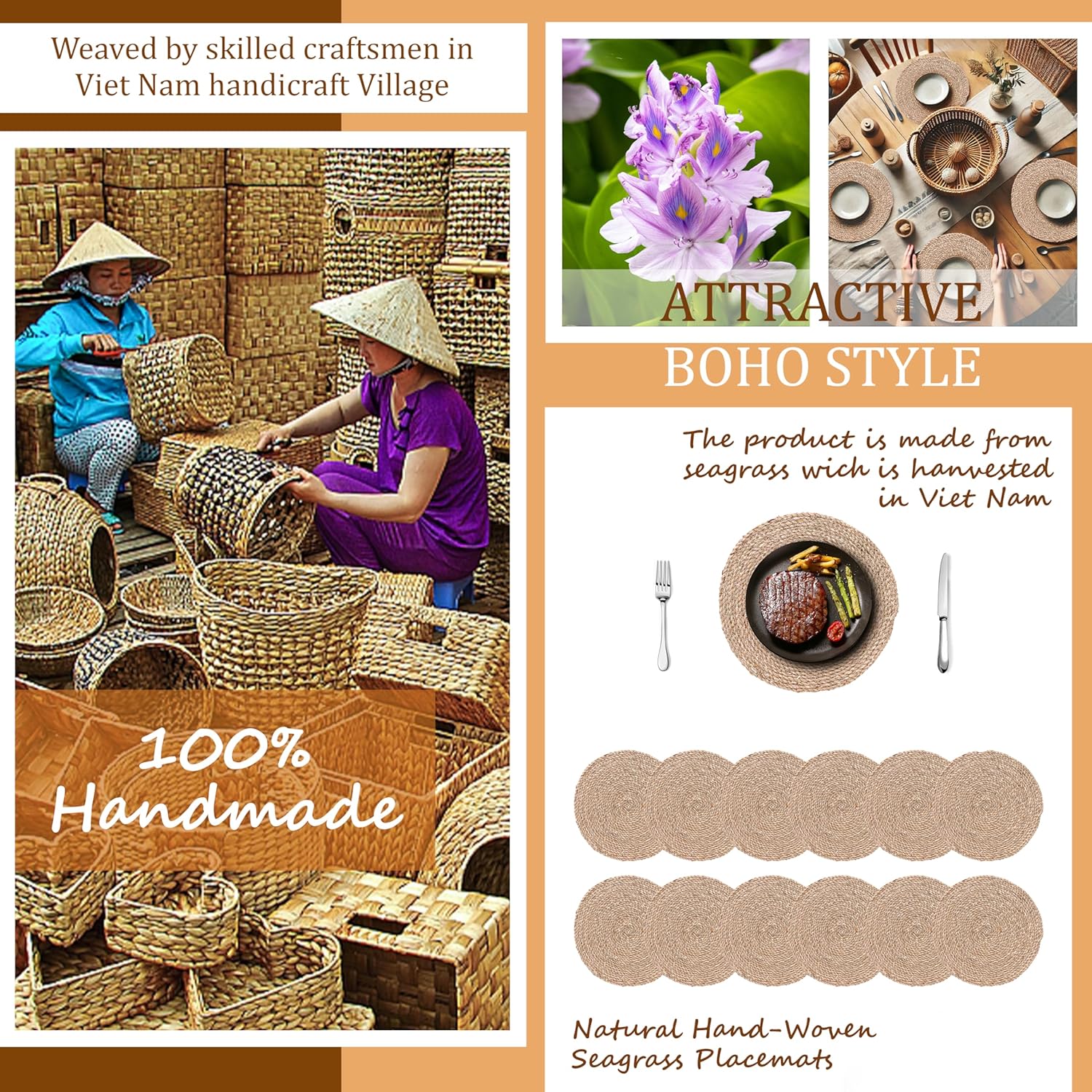 Woven Placemats Set of 12, Round 12" Boho Rattan Natural Hand-Woven Seagrass Placemats, Farmhouse Weave Place Mats, Rustic Braided Wicker Table Mats for Dining Table, Home, Wedding