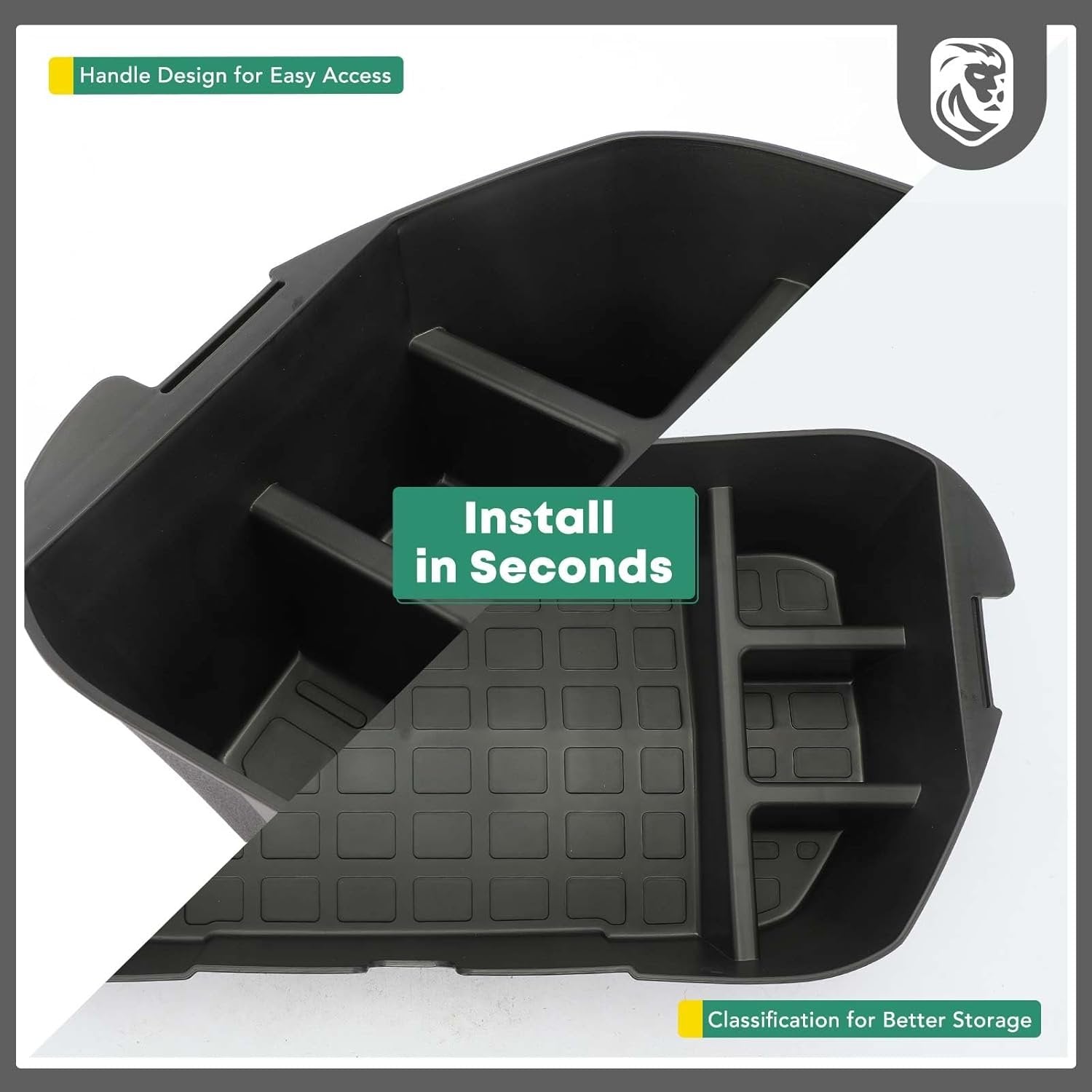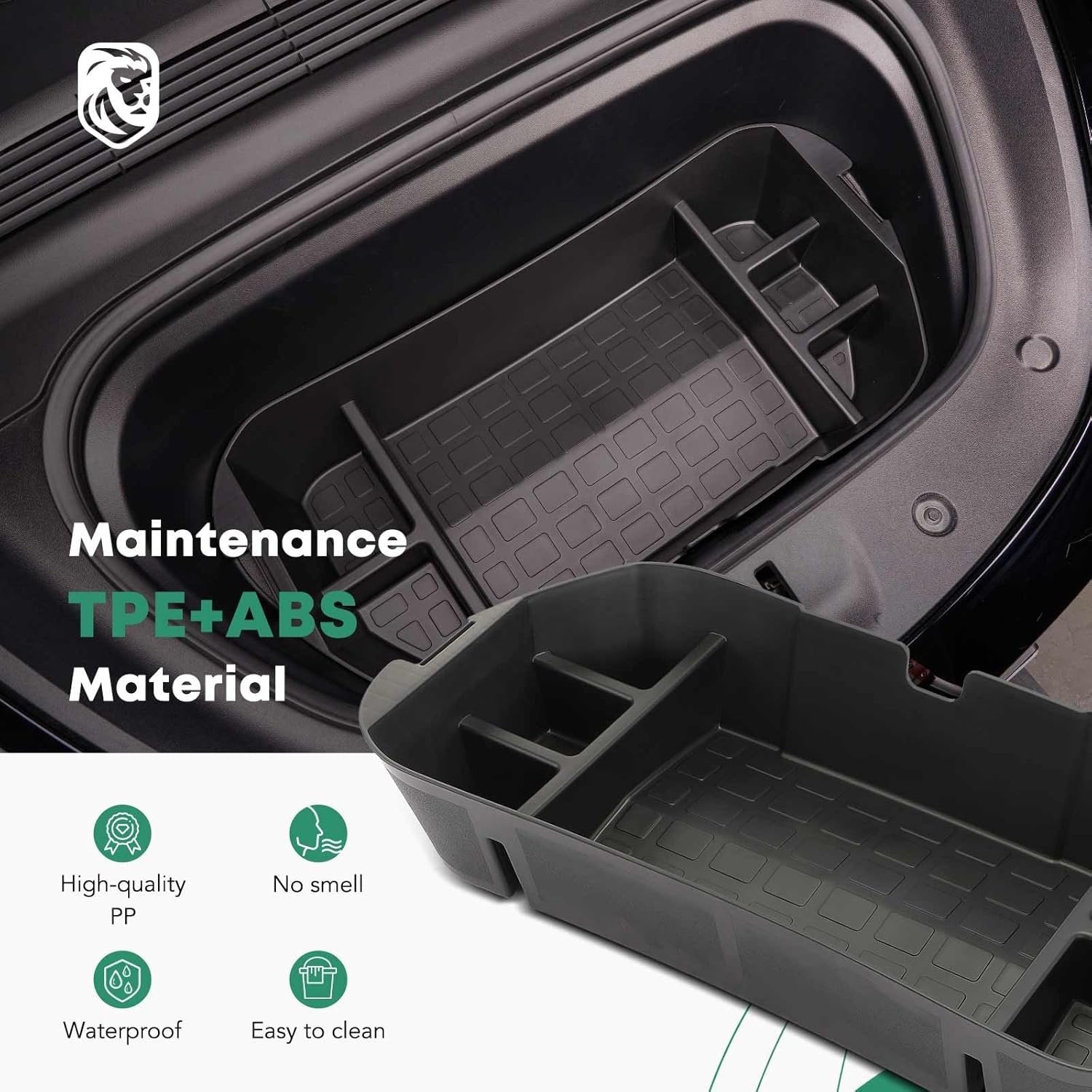 Custom Design: Fit for Tesla Model Y 2020-2024, this trunk organizer has 6 separated spaces. The design of classified storage makes it more convenient to meet larger and more diverse storage needs. Divide the space in an orderly manner to meet your storage needs Install on-the-go: Custom fit design just plug it and play, tool-free installation. Everyone can install front trunk organizer tray in a few seconds. Essential model y trunk storage bins for its precise radian and seamless fitment, as if it were a part of the original car Durable PP Plastic: Made of upgraded PP material, it features high strength, wear resistance, resistance to damage, water and oil resistance, etc. No objectional odor, storage organizer comes without unpleasant smell by temperature rising Easy to clean: PP material is waterproof and easy to clean. There is no need to worry about the time-consuming and laborious cleaning process. Just wipe the surface with a wet cloth and you can easily keep it clean and tidy Textured surface: The surface of the trunk organizer has uneven grids to prevent items from sliding. Reduce collisions to protect the items in the storage box. Precise measurements allow the car storage organizer to fit seamlessly into the model, maximizing the available space in the trunk