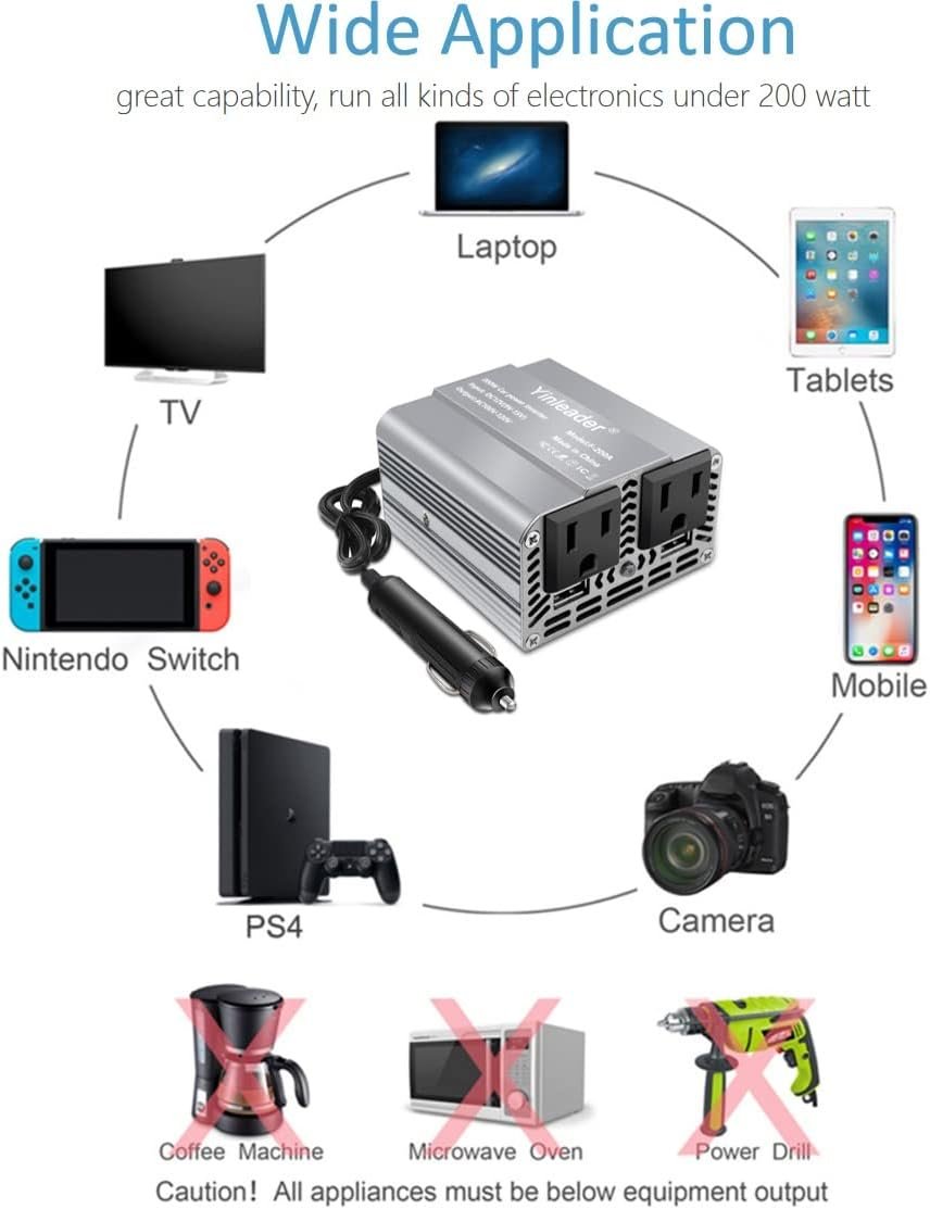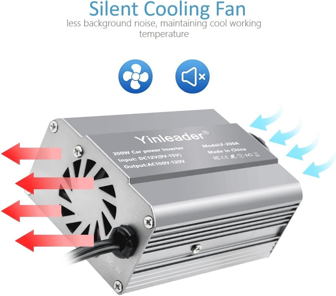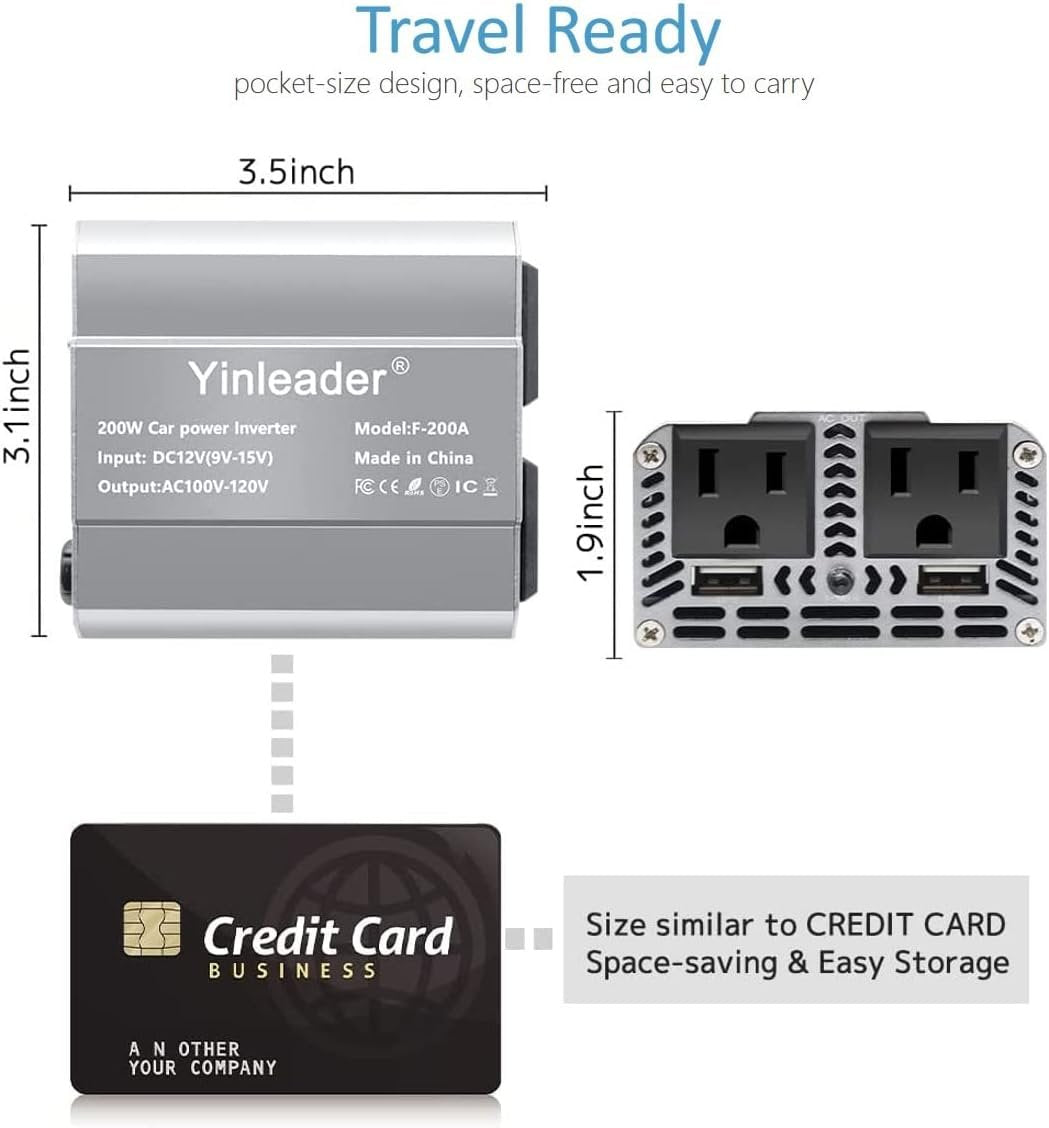 🚗200 WATT 12V INVERTER: Yinleader car power inverter provides 200 Watts continuous DC to AC power, featuring 2 AC car outlet adapters and 2 USB ports for multi-purpose charging, provide overload protection to your electronics. 🚗QUALITY CIGARETTE LIGHTER: Built-in 24 inch quality cigarette lighter, compact and sturdy. Plug and Play, no need to connect to the battery directly. Perfect power inverter for vehicles such as trucks, cars. 🚗SILENT FAN: Cooling fan works efficiently for heat dissipation, less background noise, maintaining cool working temperature for car inverter, enjoy the family time in a pleasant environment. 🚗FAST CHARGING: Dual 110V AC car plug adapters for charging devices such as laptops and smartphone, 2 USB charging ports (0-3.1A) for powering USB compatible electronics like laptop. No more issue with the lack of electricity as you get this car inverter. 🚗ALUMINUM BODY: Durable metal housing provides advanced protection from drops and bumps. Credit card-sized design, a must haves essentials for use on vacations, road trips, travel and RV camping. Offers 18-Months Warranty for no-worry buying. 🚗EASY TO CARRY: Size of 3.5 x 3.1 x 1.9 inch, super mini and lightweight, pocket-sized car power inverter, go ahead for travel without worry about no space for it.