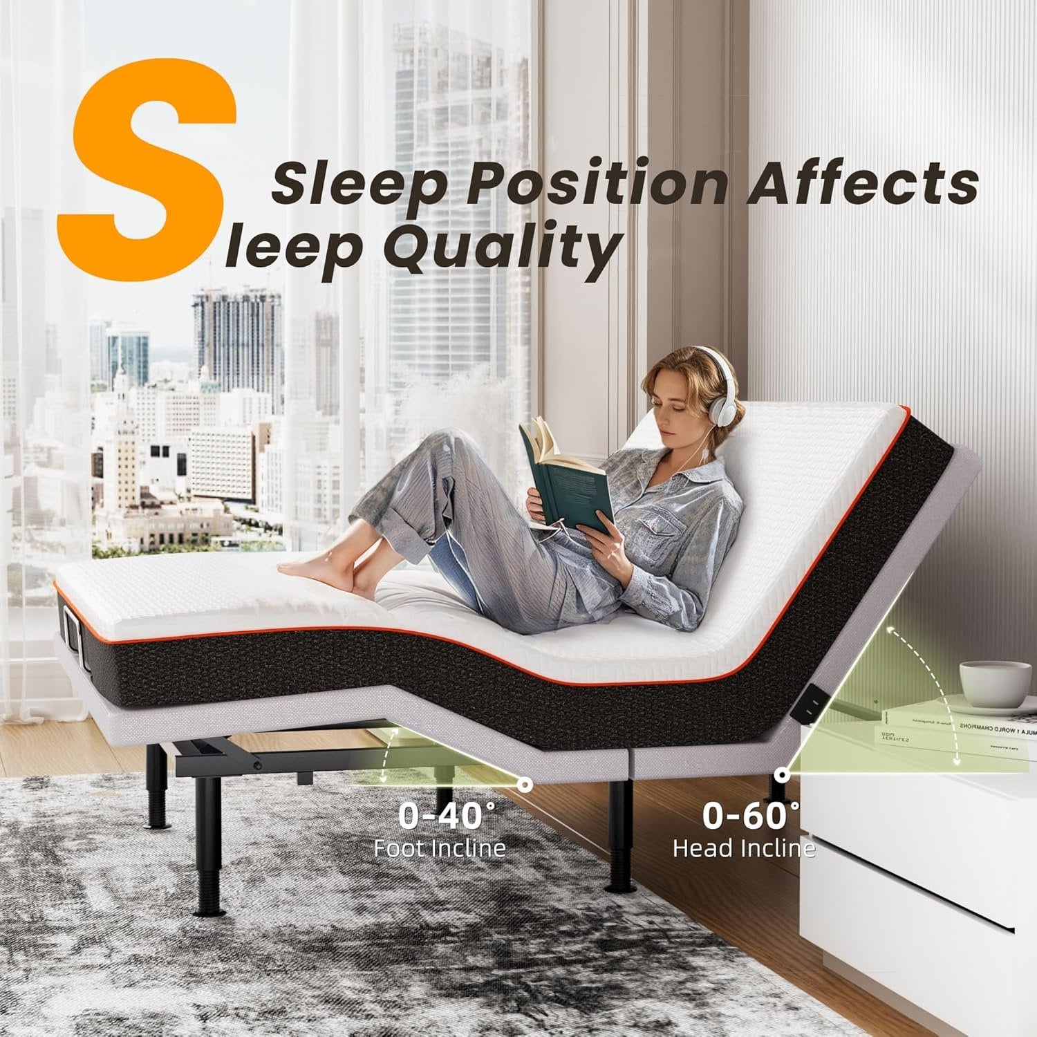 HEAD AND FOOT INCLINE: Our adjustable queen bed frame provides independent head tilt from 0 to 60 degrees and foot tilt from 0 to 40 degrees, driven by a dual silent motor. You can choose the ideal location according to your own needs. TOOL-FREE ASSEMBLY: Don't be afraid to assemble! Our electric full adjustable bed frame with remote only requires a few simple steps, including installing legs, stop bars, detailed instructions, and connecting power sources. No tools needed! CLEAR ICON DESIGN: This Queen adjustable bed frame with remote control is very user-friendly. Clear icons on the wireless remote control make operation simple. WITHSTAND 900 POUNDS: Yireehome adjustable queen bed frame with remote control has excellent load-bearing capacity and stability. It can withstand a weight of 900 pounds, making it more load-bearing than other queen size adjustable bed frame with remote. MATTRESS COMPATIBILITY: Adjustable queen size bed frame height is very suitable for all kinds of mattresses on the market, including memory foam, latex, mixed and gel foam mattresses. (Note: We only have bed frames, no inluding mattresses). ADJUSTABLE BED LEGS: The height range from floor to top is from (min) 10.12 inches to (max) 14.84 inches, making it easy to match bed frames of various heights. Adjustable height of 10.12, 11, 12, 13, 14, 14.84 inches, compatible with most bed frames.