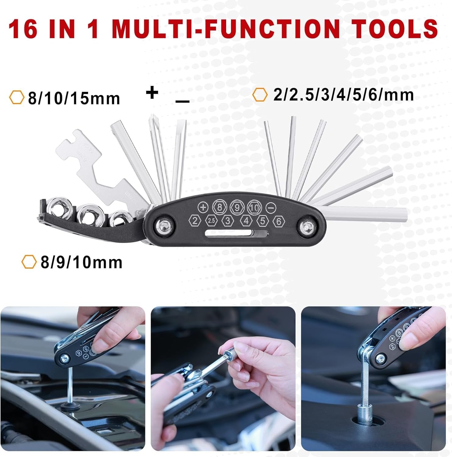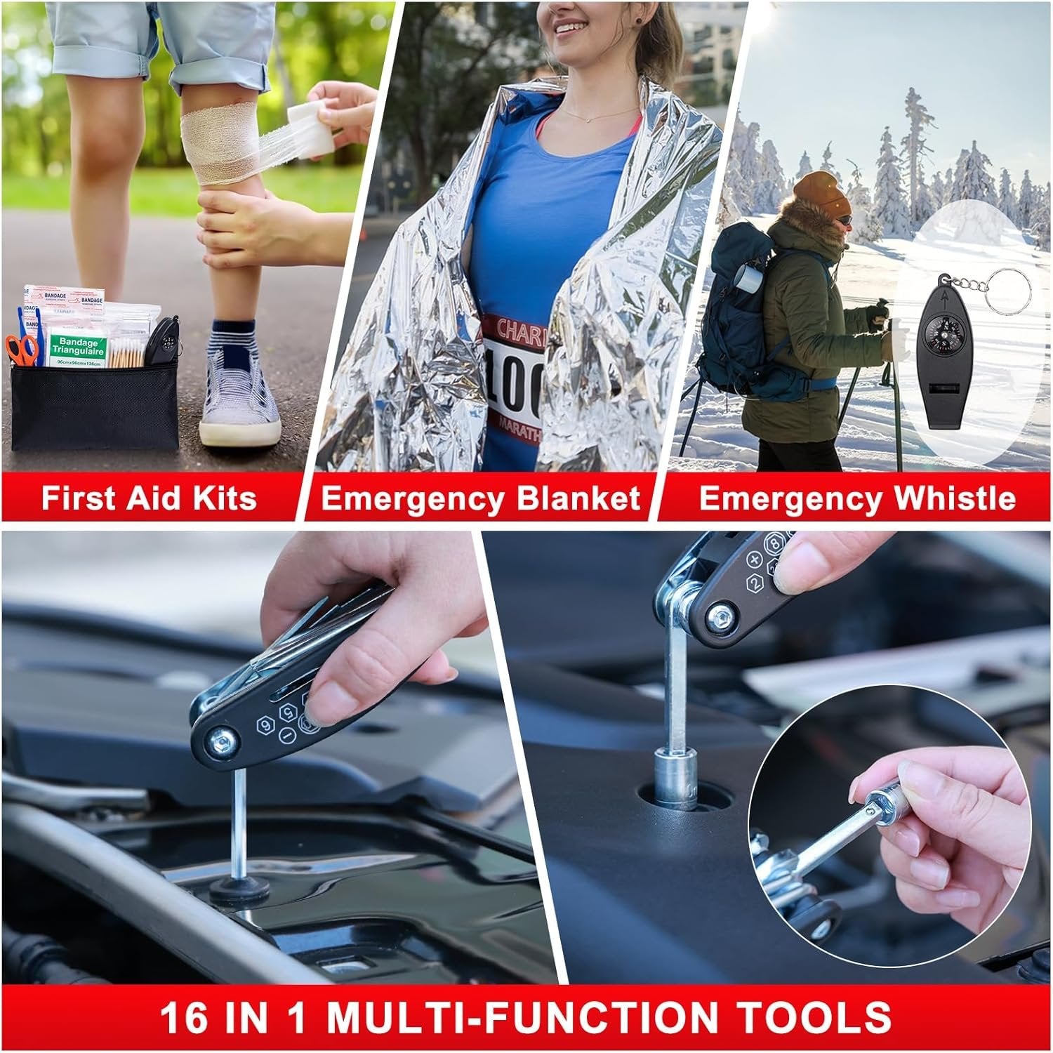 EMERGENCY CAR KIT ESSENTIALS: Have you ever had car trouble and were anxiously waiting for help? This car roadside emergency kit is suitable for every driver on the road. In any potential emergency, this safety kit will equip you with the necessary tools and items to ensure you and your car are safe 6 GAUGE JUMPER CABLES: Our heavy-duty 6 gauge thick 500 amp jumper cables are constructed with solid copper clamps to ensure optimal contact. The surface of the cable is made of high-quality PVC, which provides a long service life and higher reliability and can work typically even under low-temperature conditions PORTABLE AND COMPACT: The multifunctional shovel is foldable and comes with a carrying bag to take with you. It's the perfect emergency shovel for off-roading, RV camping, hiking, gardening, backpacking, and more EMERGENCY MULTI-FUNCTION TOOL: The multi-function tool is made of high-quality carbon steel. Its compact size and lightweight design make it easy to put into a backpack or any pocket you carry daily to meet daily maintenance needs PERFECT SOUVENIR: This roadside assistance kit is designed for novice or experienced drivers and anyone unprepared for the unexpected on the road. This thoughtful souvenir is perfect for birthdays, Christmas, graduation, and more! Imagine the gratitude they would feel if it offered them genuine assistance during an emergency