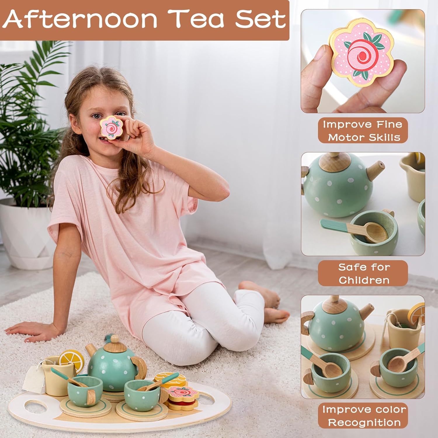 FUN TOY TEA SET FOR LITTLE GIRLS: 15PCS Tea Party Set including 1 tea tray, 1 teapot, 2 cups, 3 coasters, 1 tea bag, 2 spoons,1 lemon slices, 1 tea bag, 1 Small Cake and 1 cookie. The tea tray is 28.9cm x 17.5. Each size of accessory is suitable for children’s hands aged 2-8 which is good for exercising children's small hand grasping ability. ENHANCE PARENT AND CHILD INTERACTION: Add the right amount of milk or sugar to the tea, make the tea and then share it with friends and family.Parents encourage their kids to play with their friends or play dress up with them. With this adorable wooden toy tea set, little boys and girls will enjoy afternoon tea parties. It also promotes your child's social, emotional and motor skills and enhances imagination and creativity in conversation. BEAUTIFUL DESIGN: The tea party set comes in 4 different colors, combining selected natural elements from gentle colors to give the set a unique look. The tea set helps to attract children's attention and keep them immersed in the game. Not only is it a toy for your baby, but it is also a perfect decoration. SAFE AND DURABLE: This is an interactive toy that can be played with family and friends. It is made of high quality natural wood and all the edges of the items are polished and smooth. You can not only play with this product at home, but you can even take it outdoors and play with it in kindergartens, classrooms, and anywhere else you can think of. Help to develop children's social skills. CHRISTMAS BIRTHDAY GIFT: Adorable tea set for 3-8 years old, it can simulate the scene of adults drinking tea, so that your child can enjoy the time of afternoon tea party with family or good friends! It's a great time for mom to take a break or play with her kids. During pretend play, children's conversational skills, imagination and creativity will improve, while experiencing the satisfaction of imitating adults and playing caregiver.