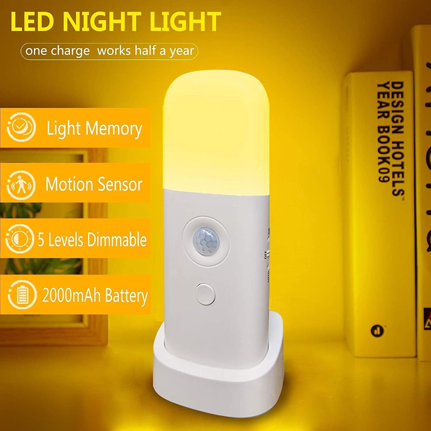 ã€PORTABLE BEDSIDE NIGHT LAMP】: This Night Light feature a compact design with a base to enrich its usage scenarios, energy-saving and with build-in light sensor. It helps you get through at night and give a soothing sleep environment. With its portable size, you can also travel with it anywhere where you want that extra light to navigate a strange place during the middle of the night. It matches any decor and super easy to use. ã€SMART LIGHT MODES】:This light can switch light modes freely to meet your different light demand.Turn the switch to ON key come into constant light mode, the light enters a constant light and 5-level dimming button can select the appropriate brightness. Switch to Auto key come into Induction mode. the light can induction dark and auto to brighten even though in a dark night. The last mode that Press the dimming button for 3 seconds to come into the SOS flashing mode. ã€Highly Functional Design】: A non-slip base for every surface & super-compact dimensions make the light an ideal travel companion. ã€USB Charged】: 2000mAh build in battery operated night light. It can work for 500 hours in human body induction mode, and up to 80 hours in standby mode. No need to buy many batteries, only need to charge with a Micro-USB cable to enjoy long-term lighting. ã€Easy to Carry】: The nightlight is perfect for hallway, bathroom, bedroom, kitchen, living room, nursery, kids room or anywhere you need some extra light.