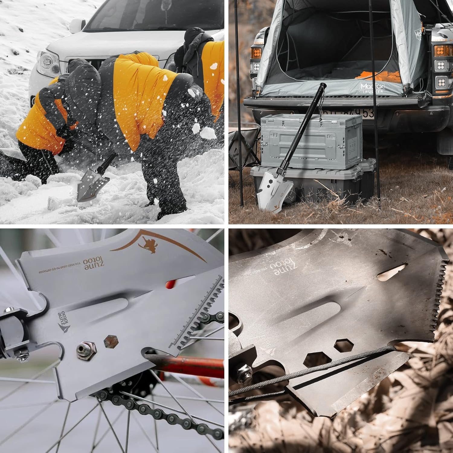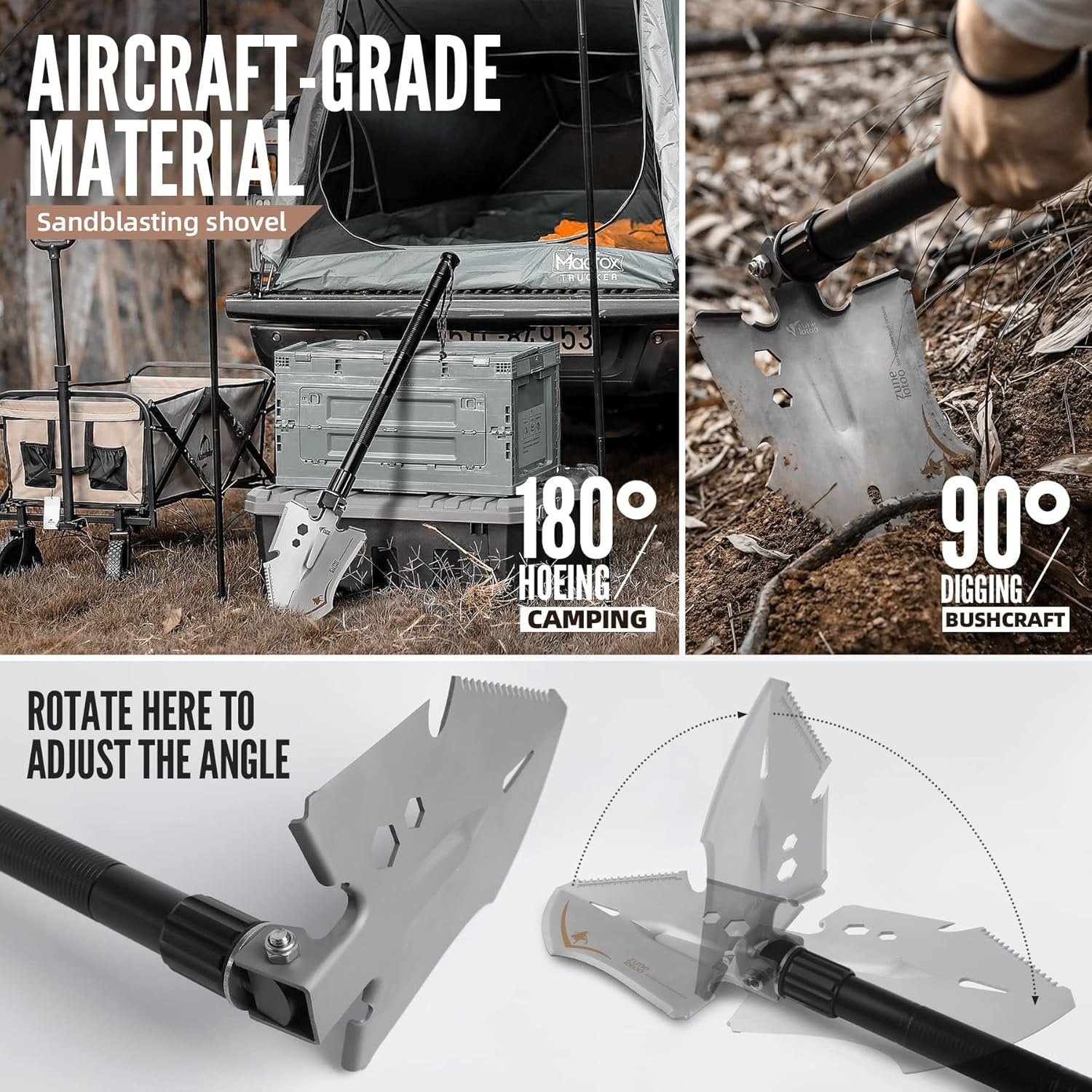 15-in-1 Multi-Functional Survival Shovel: Features an axe blade and serrated edge for chopping wood and clearing branches, plus built-in tools including a hex wrench, scale, whistle, mini harpoon, bottle opener, compass, and screwdriver. Military-Grade tactical shovel: Constructed from thickened high-carbon steel (2.3mm at thickest point) with superior rust, breakage, and wear resistance - making it ideal for wilderness survival or vehicle emergencies. Versatile Adjustable Angles - The triangular shovel head reduces resistance when digging, with 90° and 180° settings for multiple uses including digging, hooking, hoeing, shoveling and chopping. Compact & Portable: The camping shovel folds down with a 7.48x5.98" head and extends to 39.37" via four-section handle, featuring non-slip threading and metal/rubber reinforced joints for stability. Ultimate Outdoor Gifts– All components fit neatly into a compact carry bag, making it great for camping, hiking, off-roading, fishing, emergencies or gardening—Excellent gifts for survivalists, hunters, preppers and outdoor adventurers.
