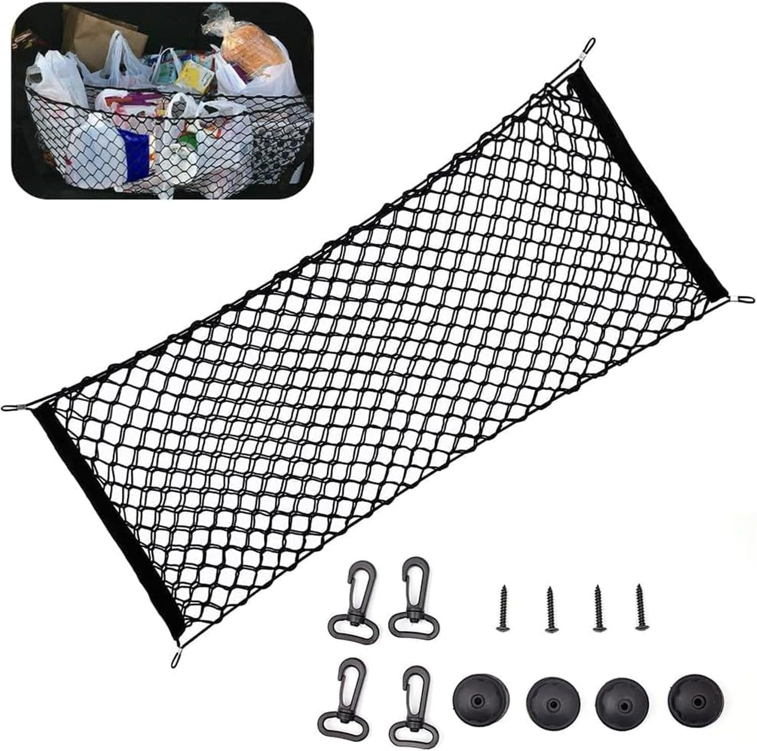 Size-35.4x15.8in Vehicle service type-Van, SUV, Truck Material-Polyester, Nylon Colour-Black With a large coverage area and a durable black elastic mesh composition, this cargo net will safeguard against bashed and broken goods in trunks and on truck beds. It offers excellent organization and a long-lasting solution to your storage issues. Cargo nets are invaluable for holding tool chests, sports equipment, parcels, and suitcases in place as you drive. No need to worry about potential injuries caused by loose items in the trunk; the stability of the net mesh is second to none and will hold fast even if you need to slam on the brakes. Advantage: 1. It help you drive organized & be clutter-free, keep loose items from getting thrown around in your hatch. 2.Mesh Storage Net - Black Mesh Trunk Cargo Organizer. 3. You can Fit grocery bags across perfectly without worrying about them falling over in the back of your car. 4. The organizer keeps your trunk and storage area Organized and Clutter Free. The Truck net Holds everything in place where you put it. 5. The cargo net Help to organize or store groceries, gear, tools and other items. 6. The Truck Cargo net is made from High Quality polyester material to ensure Durability and Longevity. Packaging Detail: 1. Cargo Net*1pc 2. 4 X Mounting Adapter and Screw 3. 4 X Hooks Aochol Rear Cargo Net has premium quality - Made out of durable polyester material to ensure longevity, thick and won't tear or rip easily. Aochol Rear Cargo Net could keep your car organized - Great storage solution to help you drive organized & be clutter-free, keep loose items from getting thrown around in your hatch, you don't have to worry about things rolling around while you are driving so save your time to find item under seats or somewhere in your car. Big capacity - The Trunk Storage Net is measuring 35 x 12 (90cm x 30cm) and it can stretch till 43 (110cm), the truck net stretches around your stuff and you can cram even more things in it than ever before. Easy Assembly- Just Attach Them to The Headrest Posts with Swivel Clips and Detach. Suitable for - Ideal for rear cargo storage in cars, vans, trucks, and SUVs.